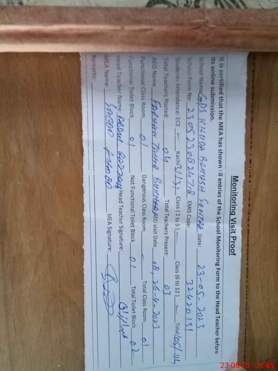 | Attendance Register | Head Teacher | MEA with School | Visit Proof |