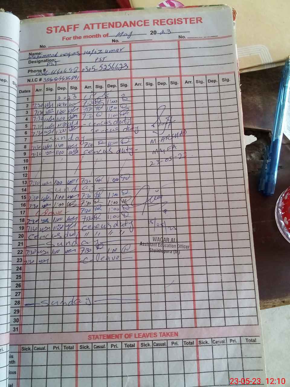 | CNIC | Full Name | Designation | R/C | Absence During Last Calender Month |