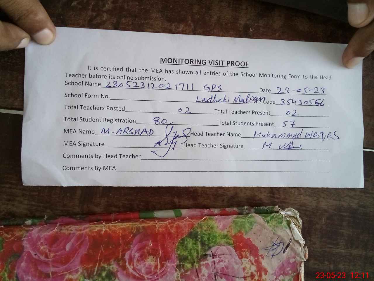 | Attendance Register | Head Teacher | MEA with School | Visit Proof |