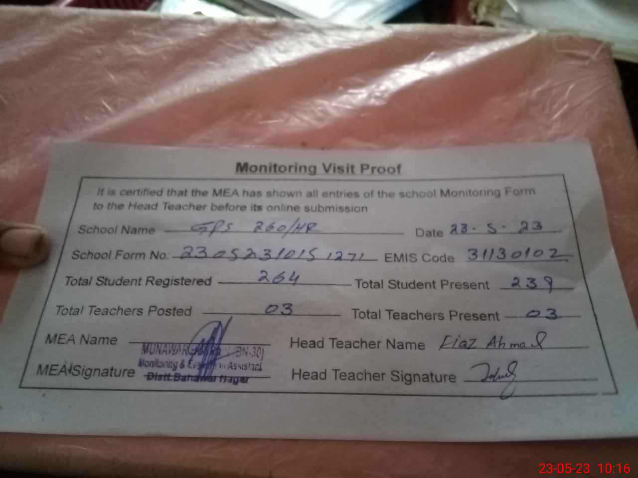 | Attendance Register | Head Teacher | MEA with School | Visit Proof |
