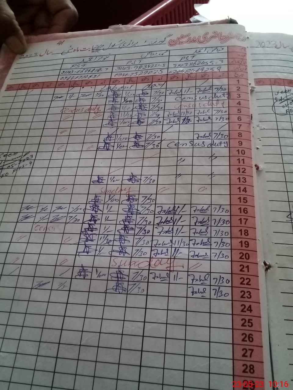 | CNIC | Full Name | Designation | R/C | Absence during last cal. month |