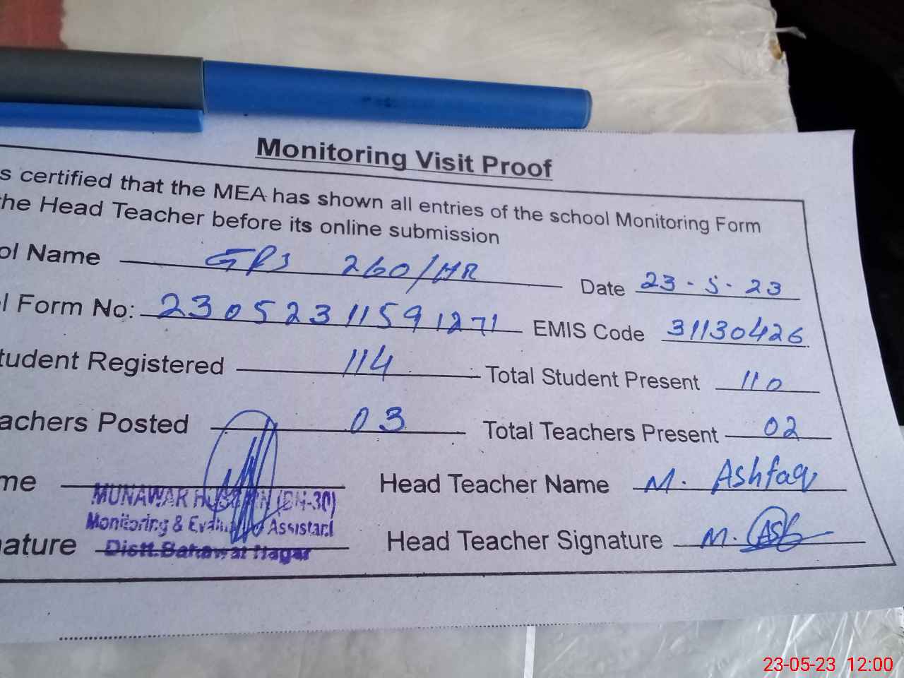 | Attendance Register | Head Teacher | MEA with School | Visit Proof |