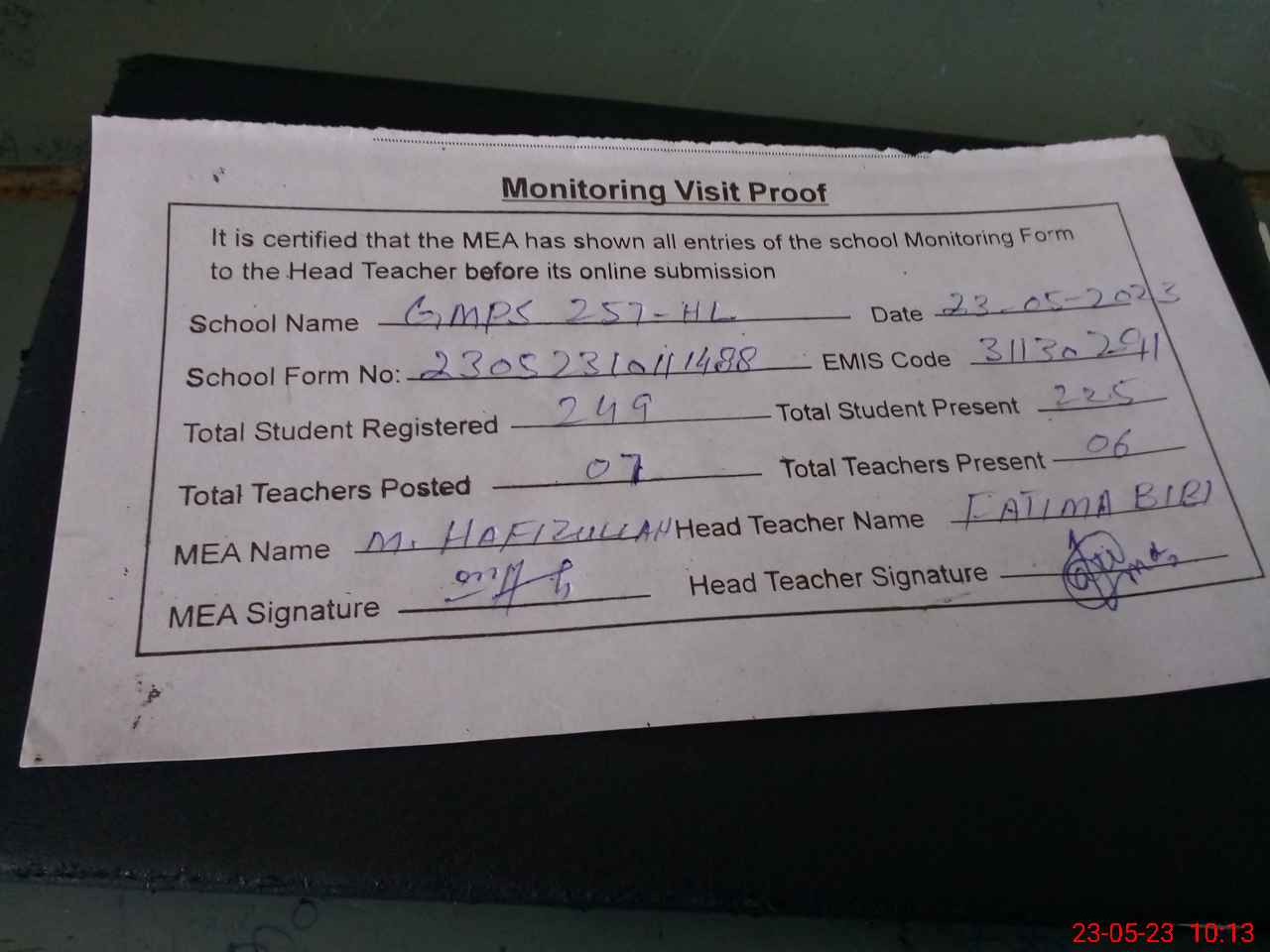 | Attendance Register | Head Teacher | MEA with School | Visit Proof |