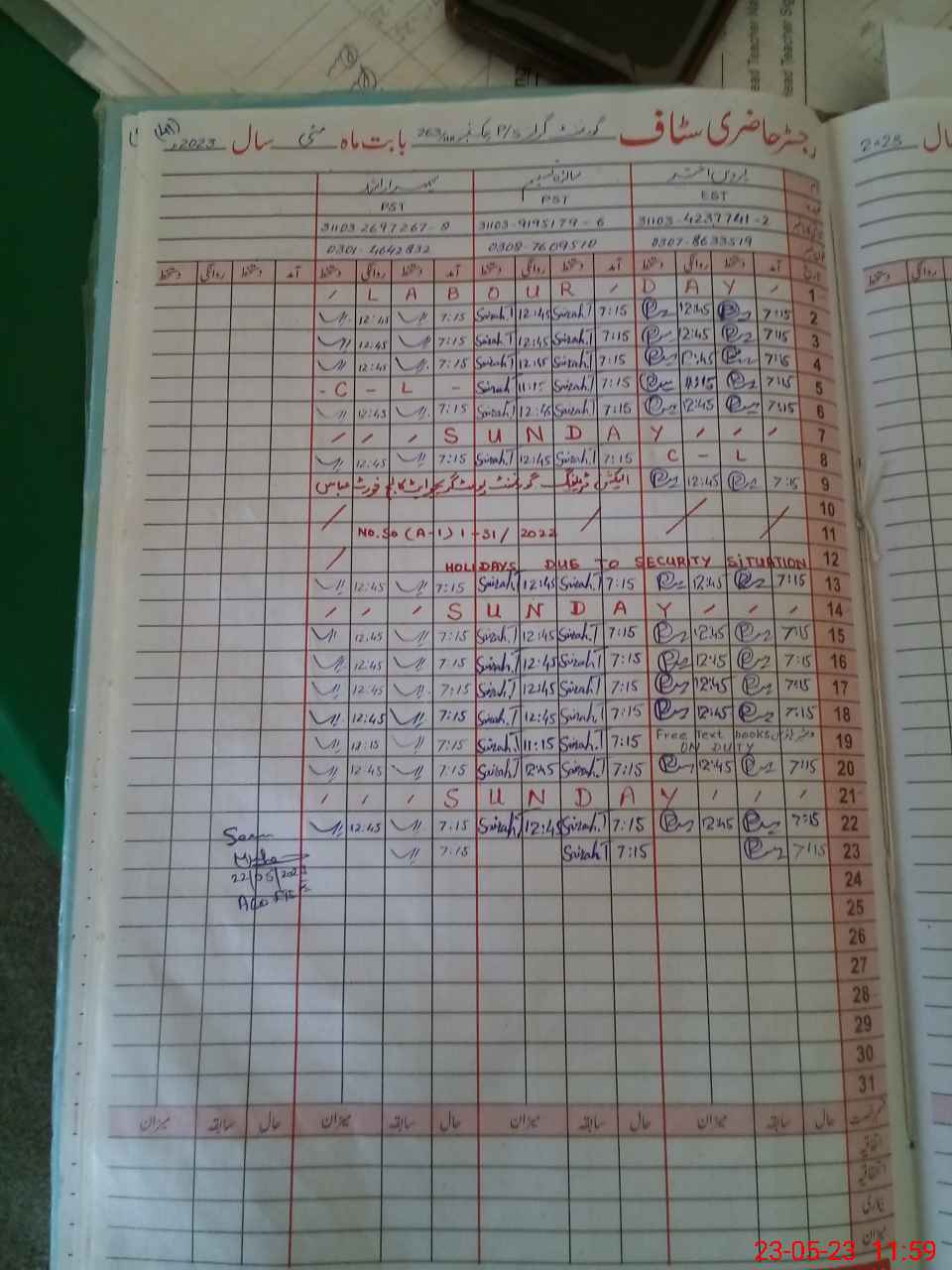 | CNIC | Full Name | Designation | R/C | Absence During Last Calender Month |