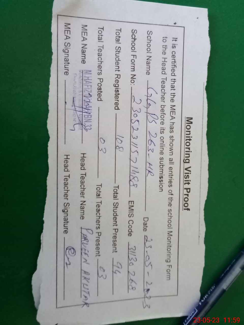 | Attendance Register | Head Teacher | MEA with School | Visit Proof |