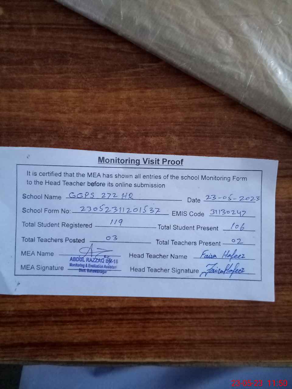 | Monitoring Date: 23-05-2023 | Start Time: 23-05-2023 11:20 AM | End Time: 23-05-2023 11:50 AM | Name of MEA: Ab**** Ra**** BN**** | |