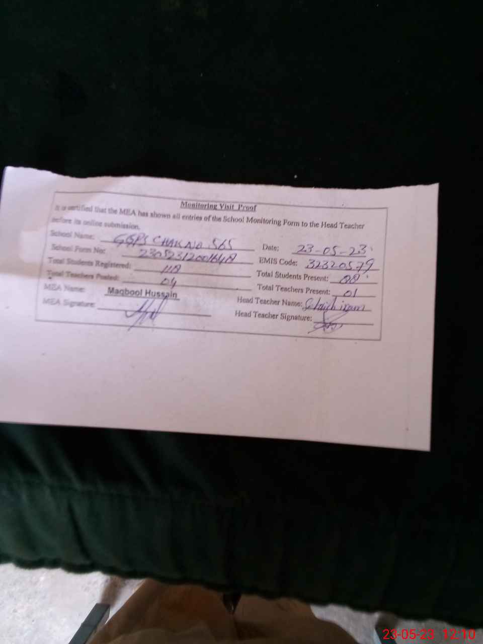 | Attendance Register | Head Teacher | MEA with School | Visit Proof |