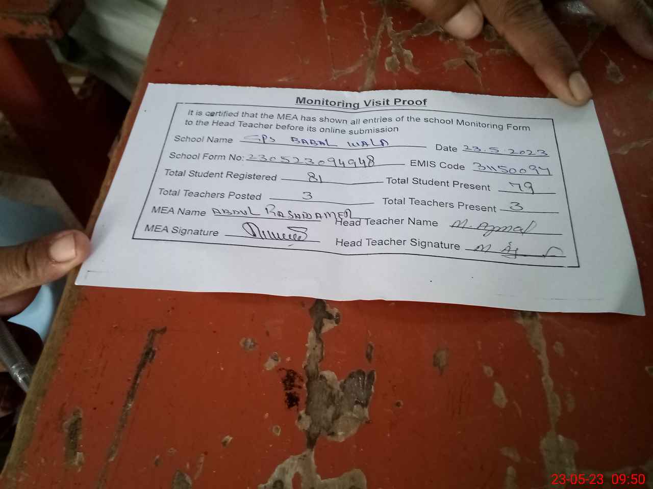 | Attendance Register | Head Teacher | MEA with School | Visit Proof |