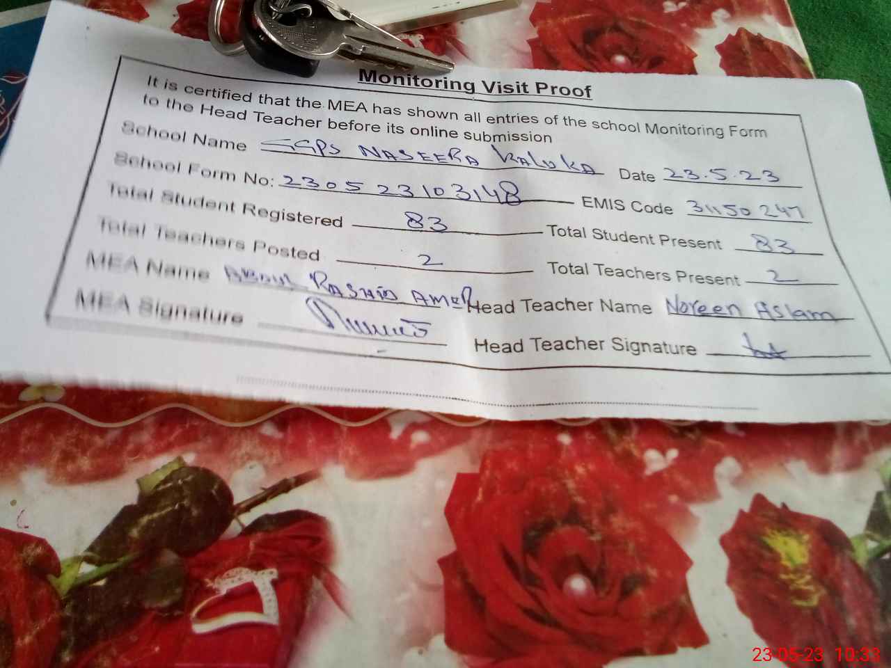 | Attendance Register | Head Teacher | MEA with School | Visit Proof |