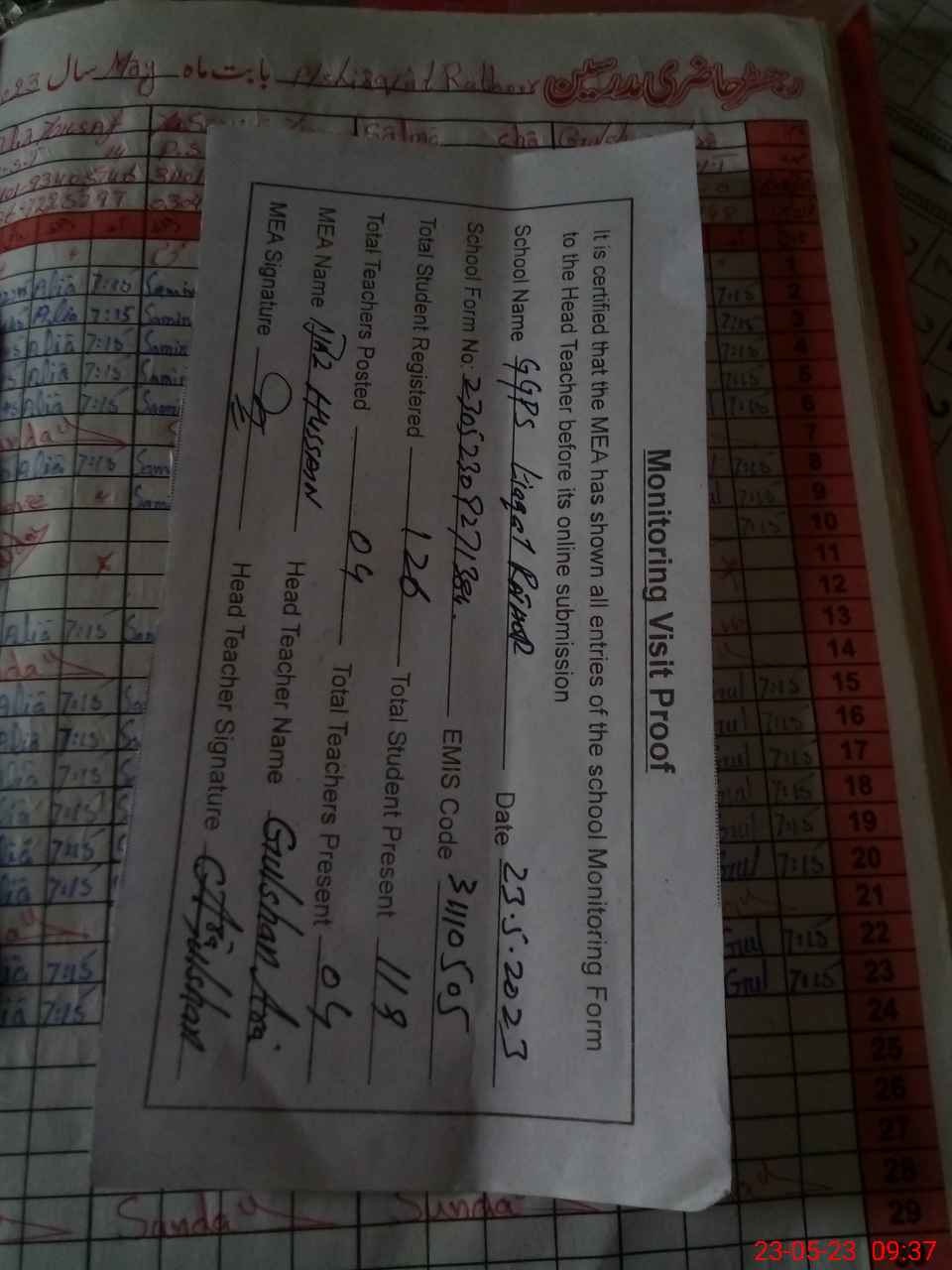 | Attendance Register | Head Teacher | MEA with School | Visit Proof |