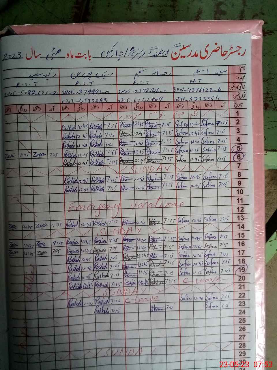 | CNIC | Full Name | Designation | R/C | Absence During Last Calender Month |