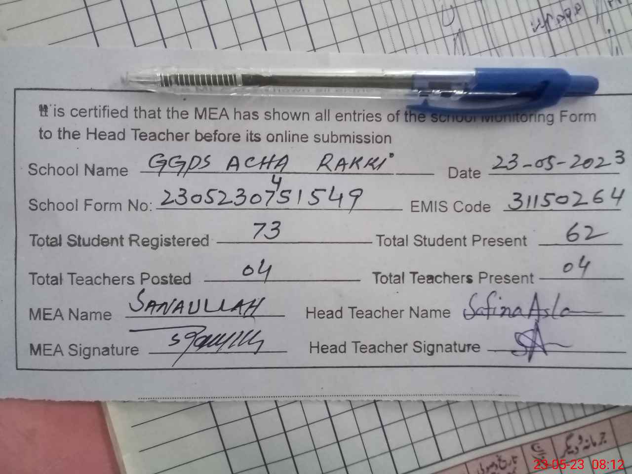| Attendance Register | Head Teacher | MEA with School | Visit Proof |