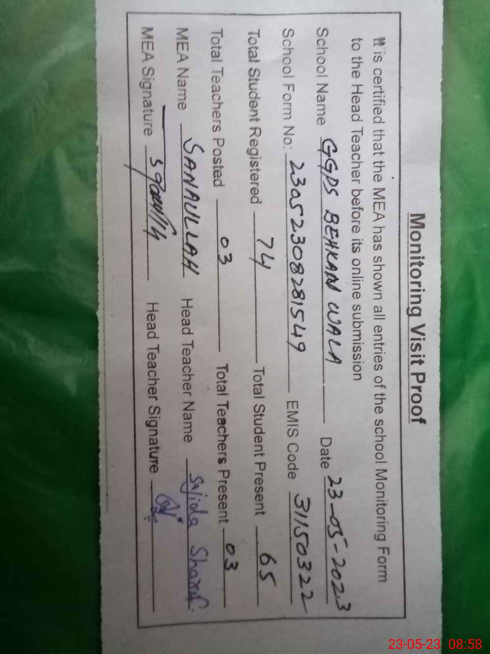 | Attendance Register | Head Teacher | MEA with School | Visit Proof |