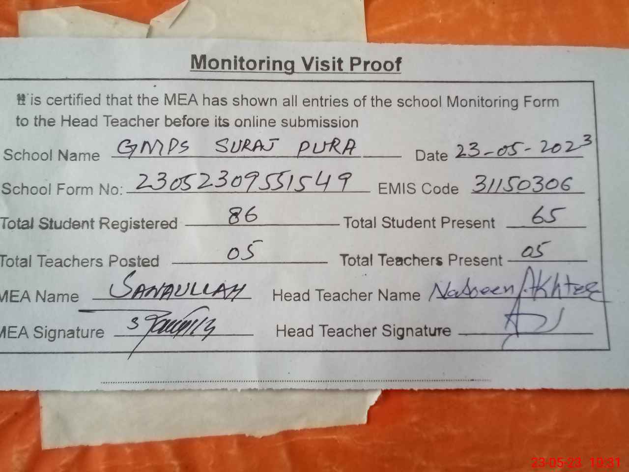 | Attendance Register | Head Teacher | MEA with School | Visit Proof |