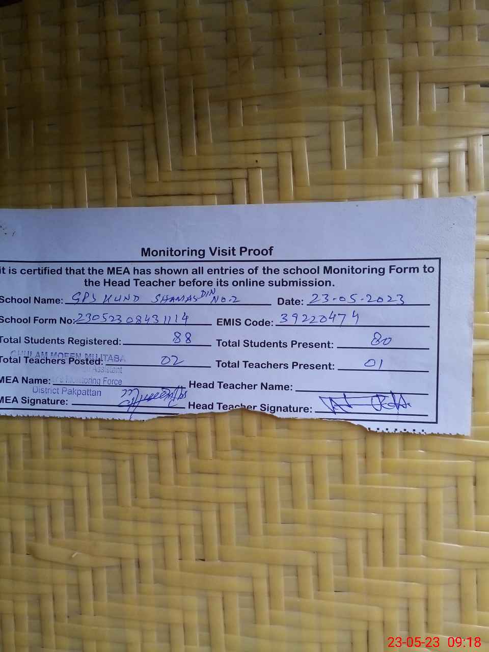 | Monitoring Date: 23-05-2023 | Start Time: 23-05-2023 08:43 AM | End Time: 23-05-2023 09:18 AM | Name of MEA: Gh**** Mu**** Mu**** (R**** | |