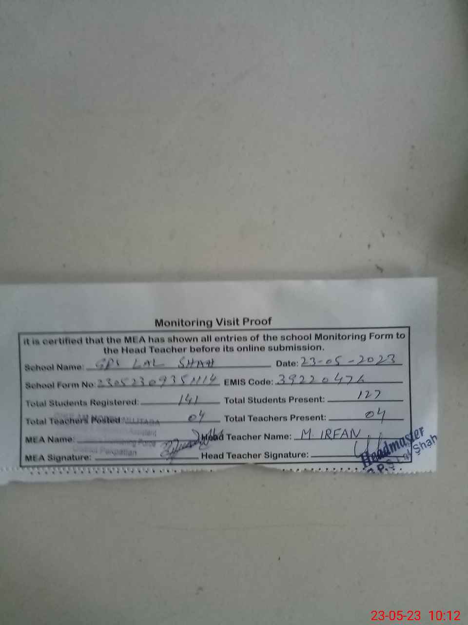 | Attendance Register | Head Teacher | MEA with School | Visit Proof |