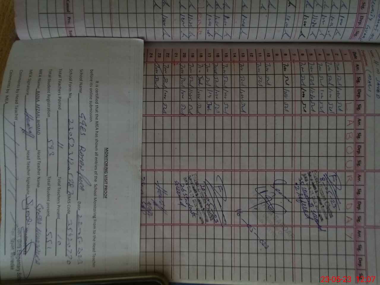 | Attendance Register | Head Teacher | MEA with School | Visit Proof |