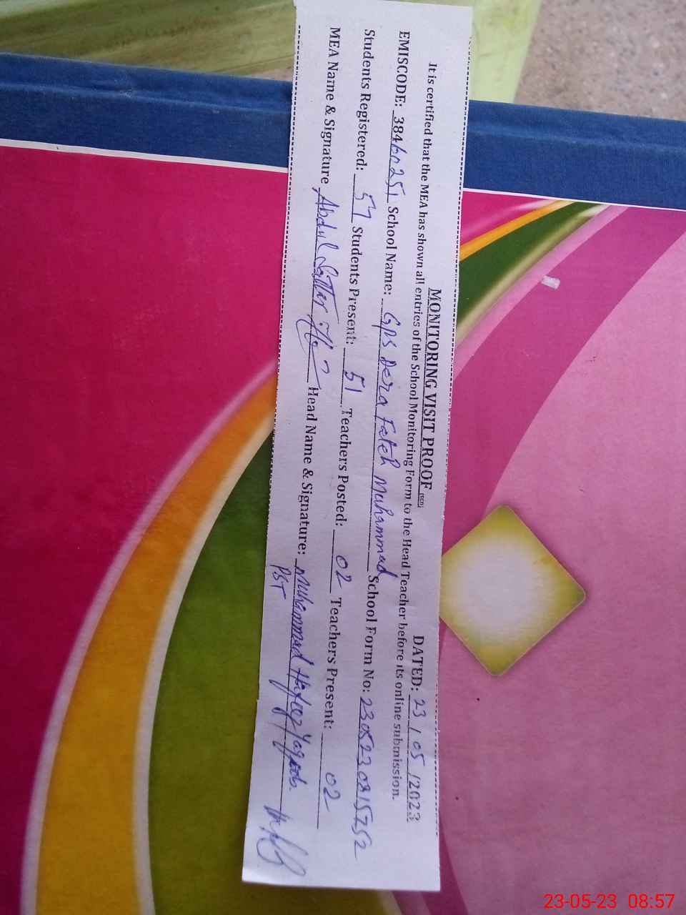 | Attendance Register | Head Teacher | MEA with School | Visit Proof |