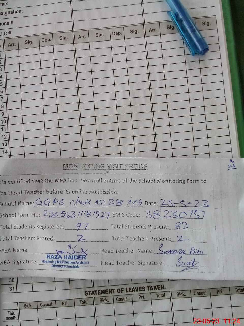 | Attendance Register | Head Teacher | MEA with School | Visit Proof |
