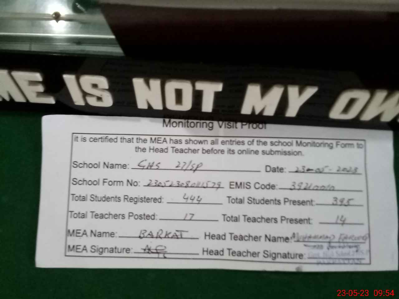 | EMIS Code: 39210010 | Name of School: GHS 27 SP | |||