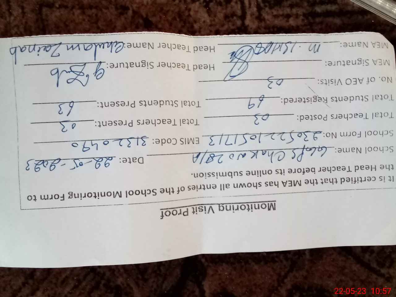 | Certified that this School was Inspected by the Undersigned MEA/DMO Today and the Information Stated Above is as Per Record. | |||||