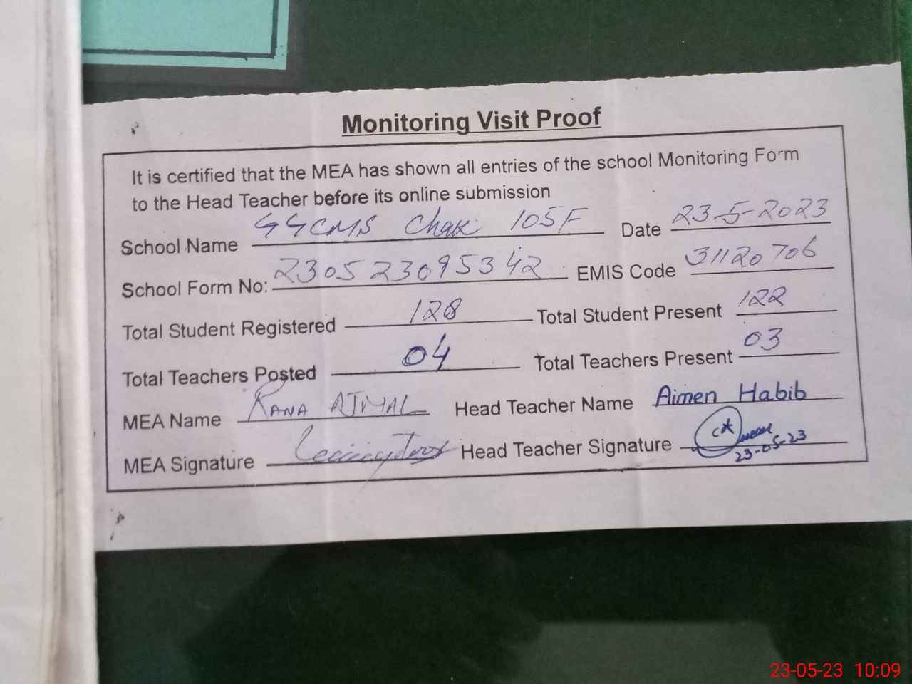 | Attendance Register | Head Teacher | MEA with School | Visit Proof |