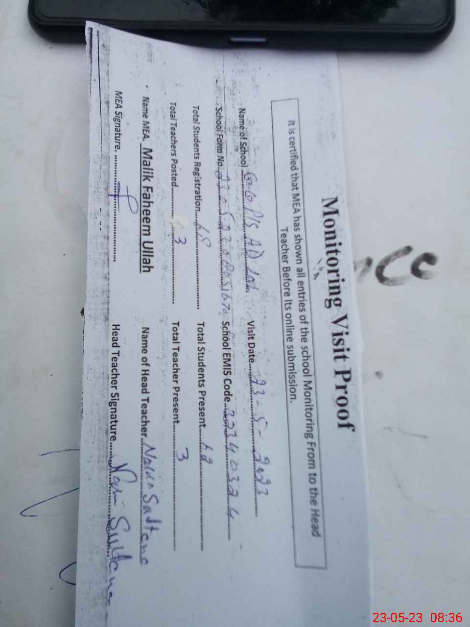 | Attendance Register | Head Teacher | MEA with School | Visit Proof |