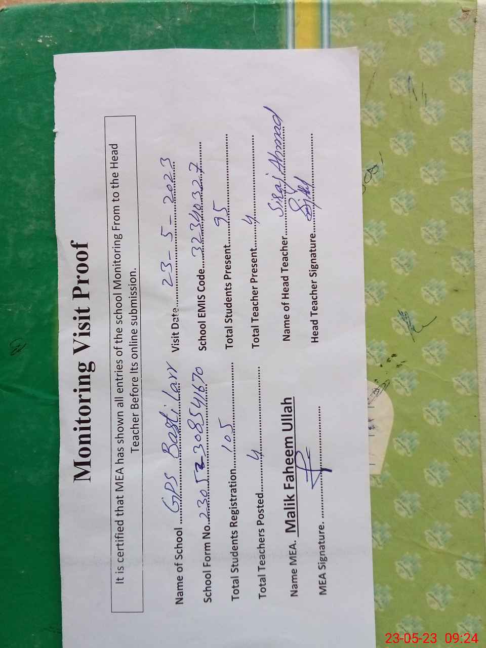 | Attendance Register | Head Teacher | MEA with School | Visit Proof |
