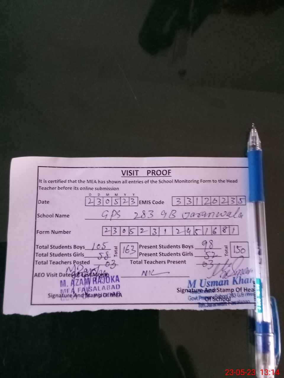| Attendance Register | Head Teacher | MEA with School | Visit Proof |