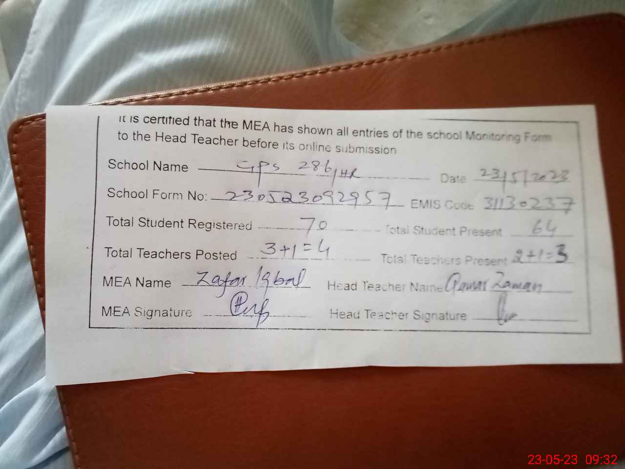 | EMIS Code: 31130237 | Name of School: GPS CHAK NO 286 HR | |||