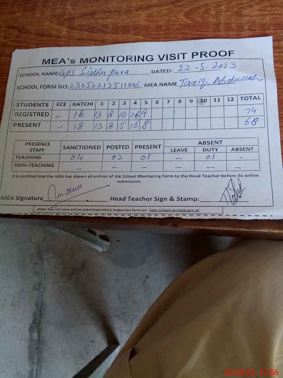 | Attendance Register | Head Teacher | MEA with School | Visit Proof |