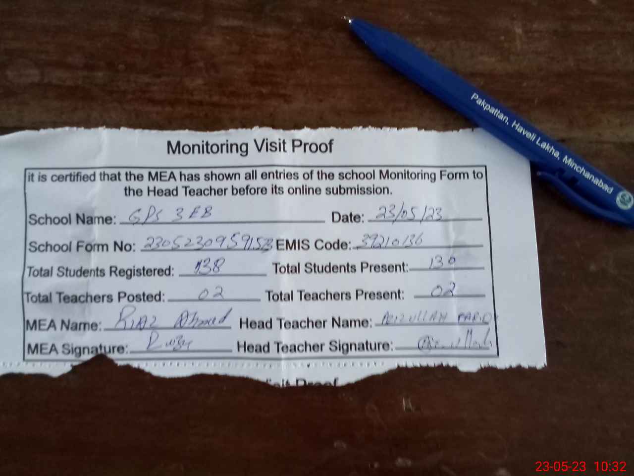 | Attendance Register | Head Teacher | MEA with School | Visit Proof |