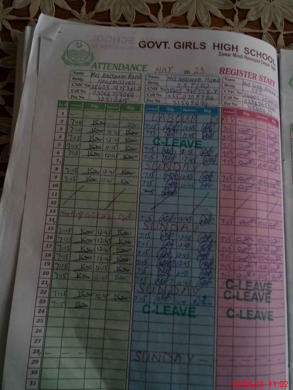 | CNIC | Full Name | Designation | R/C | Absence During Last Calender Month |