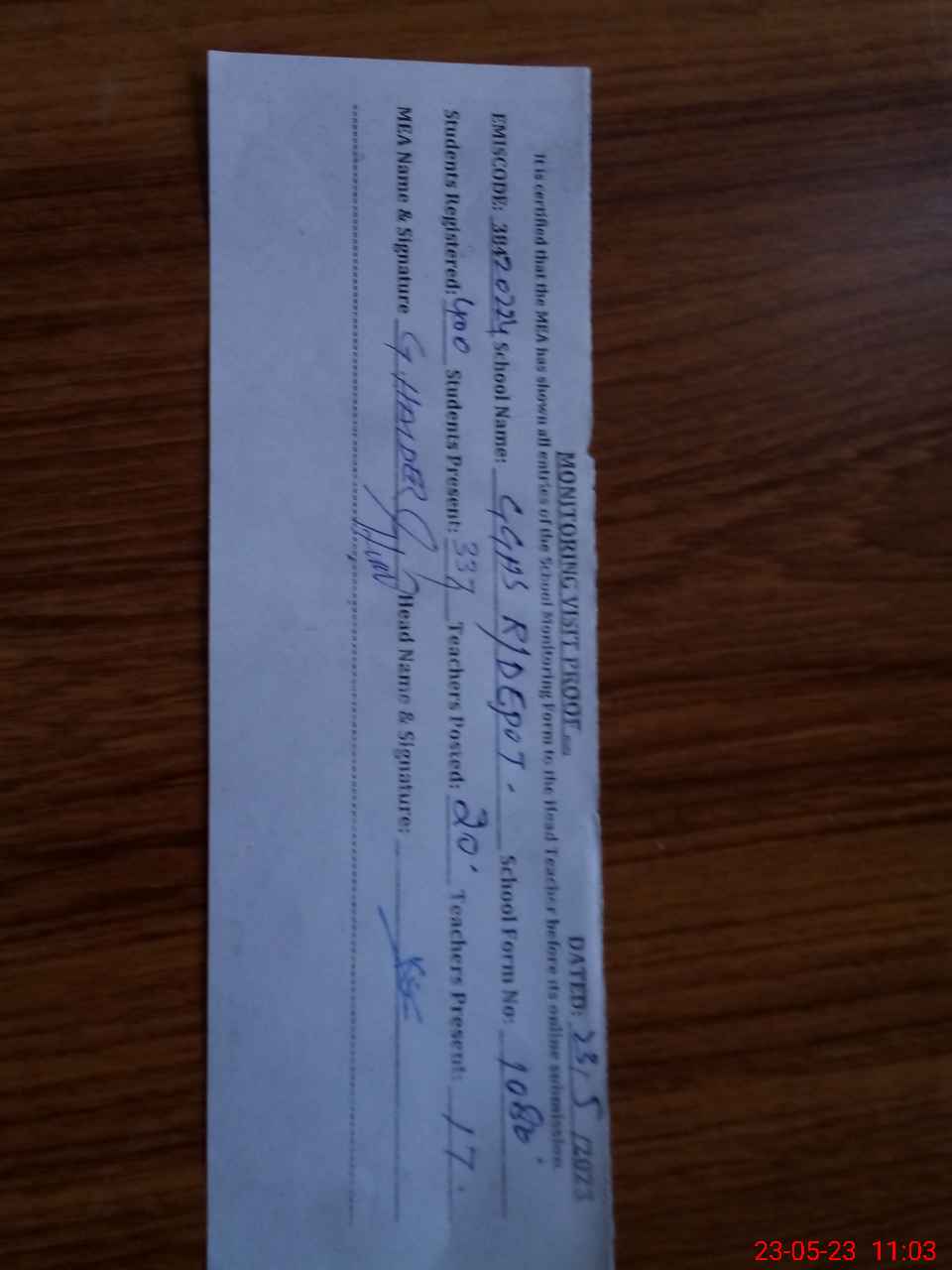 | Attendance Register | Head Teacher | MEA with School | Visit Proof |