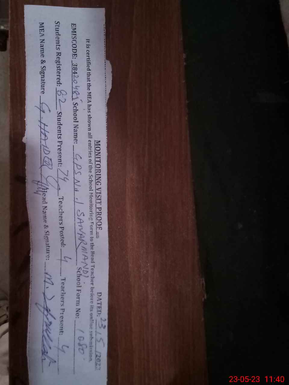 | Attendance Register | Head Teacher | MEA with School | Visit Proof |