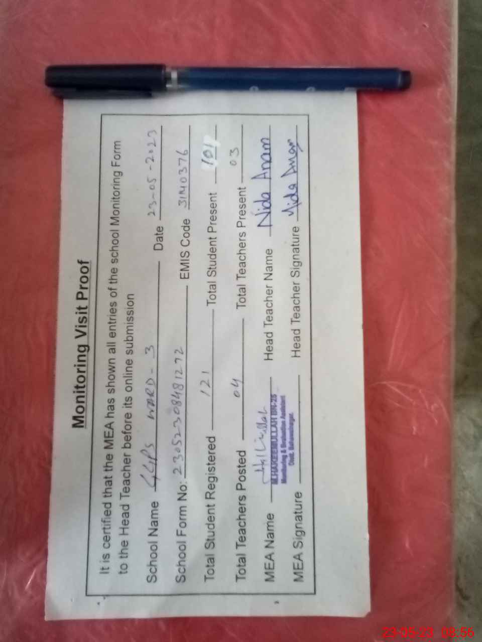 | Attendance Register | Head Teacher | MEA with School | Visit Proof |