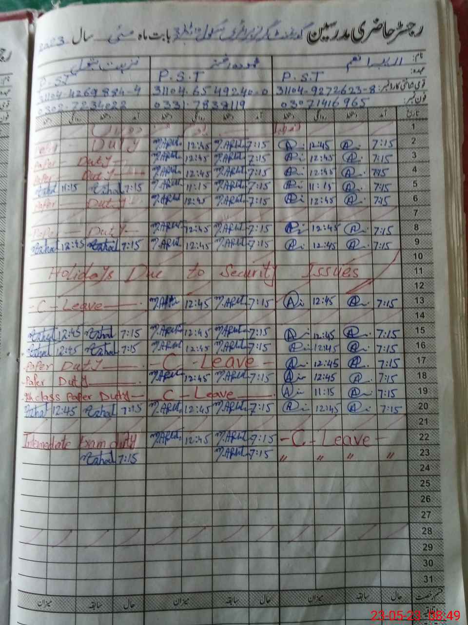 | CNIC | Full Name | Designation | R/C | Absence During Last Calender Month |