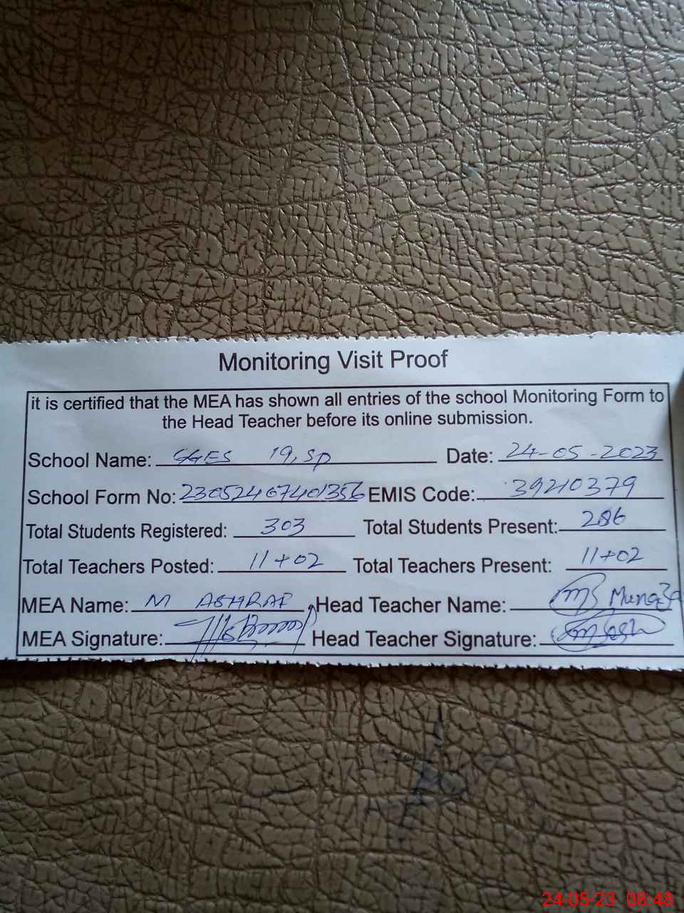 | Attendance Register | Head Teacher | MEA with School | Visit Proof |