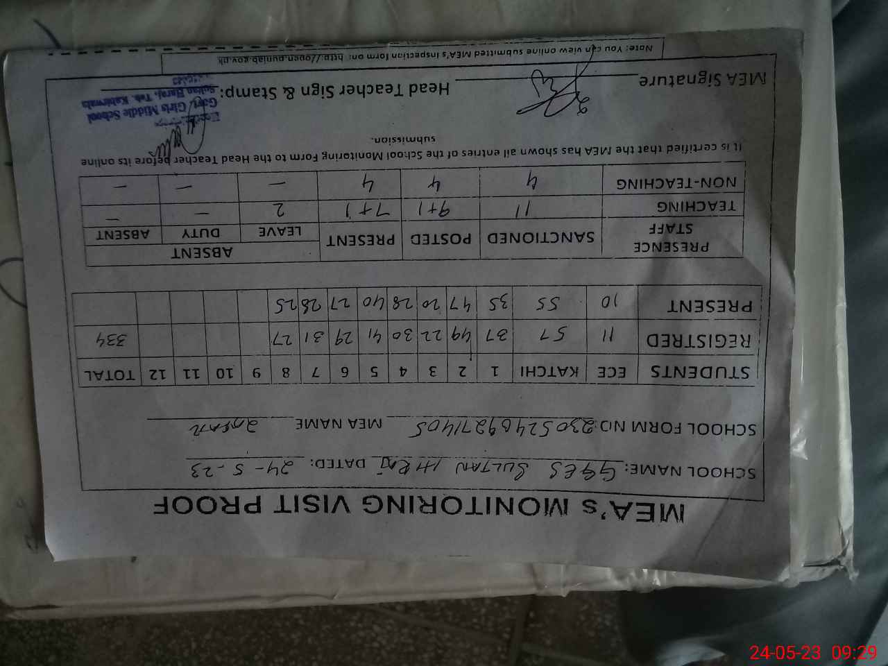 | Attendance Register | Head Teacher | MEA with School | Visit Proof |