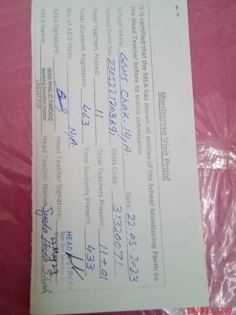 | Attendance Register | Head Teacher | MEA with School | Visit Proof |