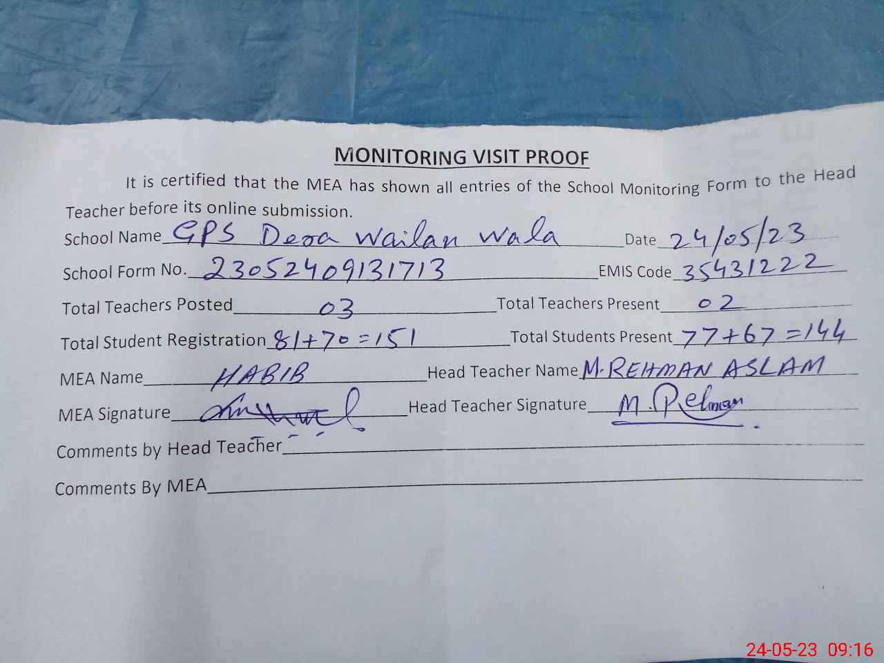 | EMIS Code: 35431222 | Name of School: GPS DERA WAILAN WALA | |||
