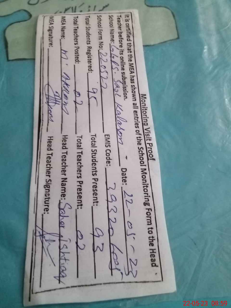 | Attendance Register | Head Teacher | MEA with School | Visit Proof |