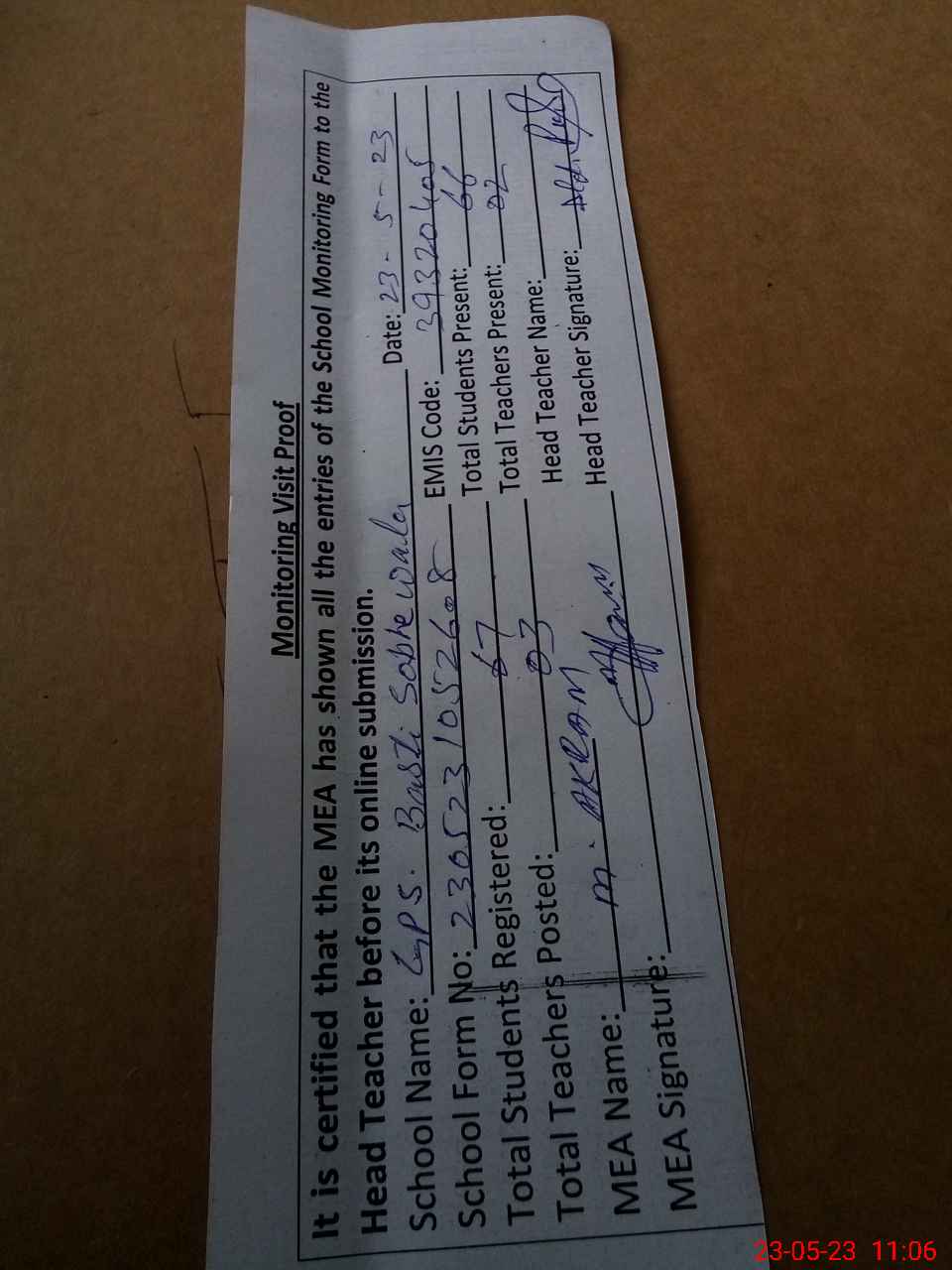 | Attendance Register | Head Teacher | MEA with School | Visit Proof |