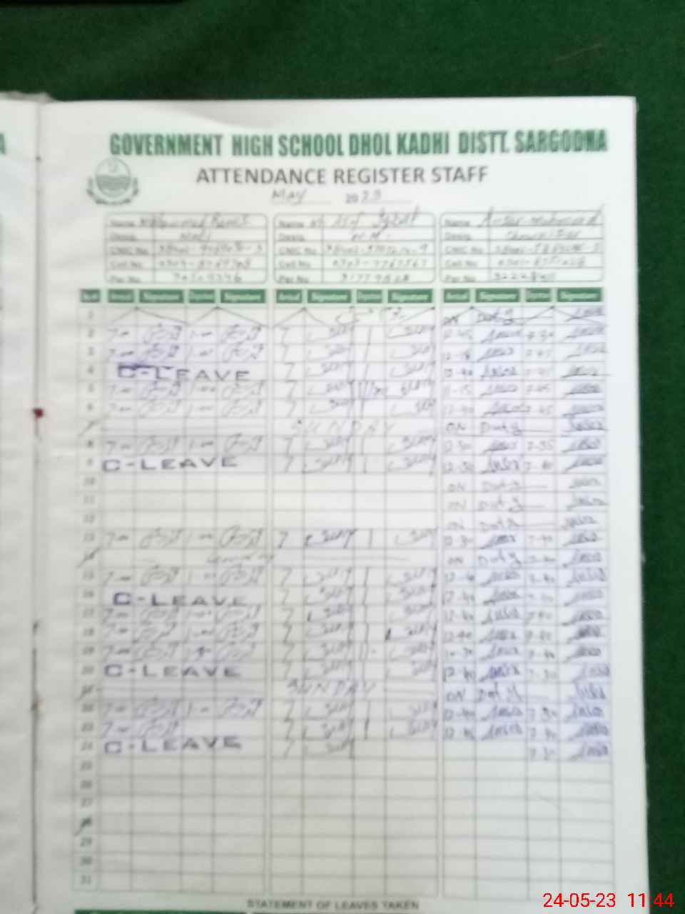 | CNIC | Full Name | Designation | R/C | Absence During Last Calender Month |