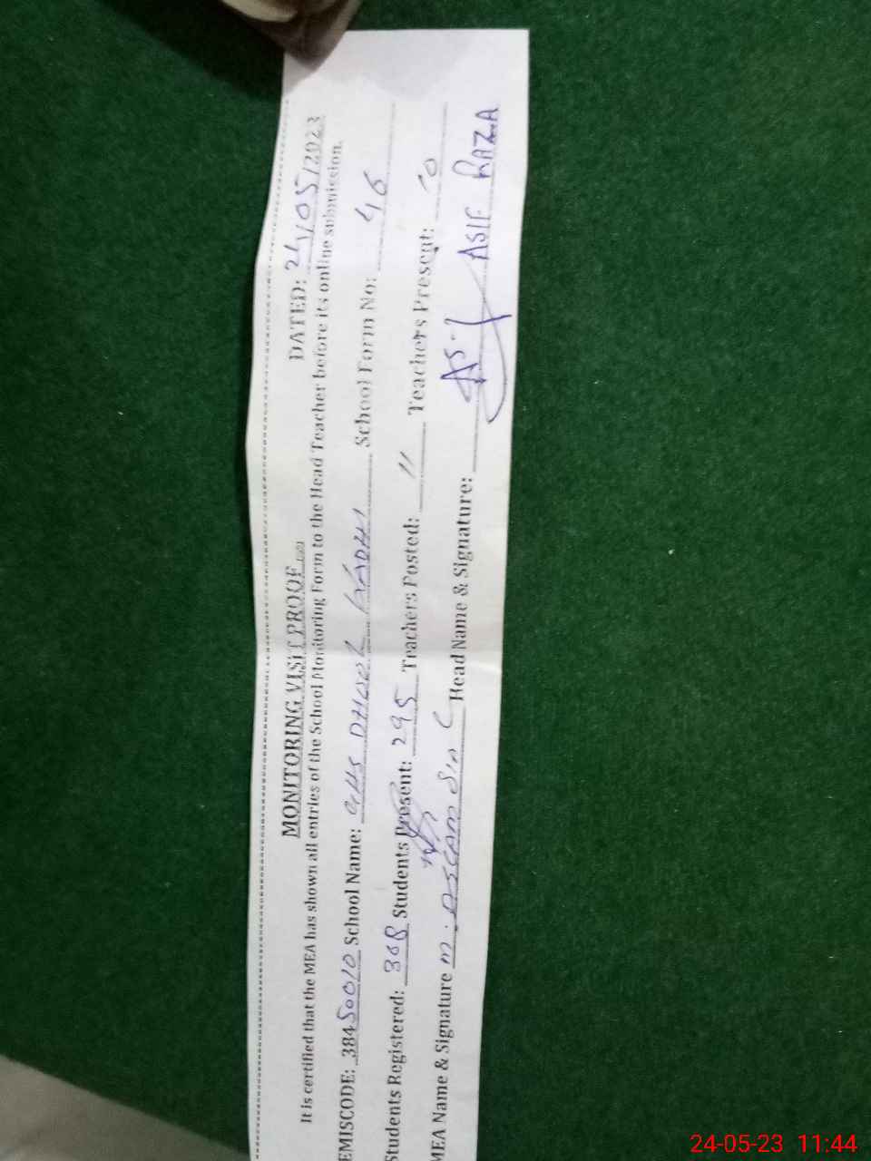| Certified that this School was Inspected by the Undersigned MEA/DMO Today and the Information Stated Above is as Per Record. | |||||