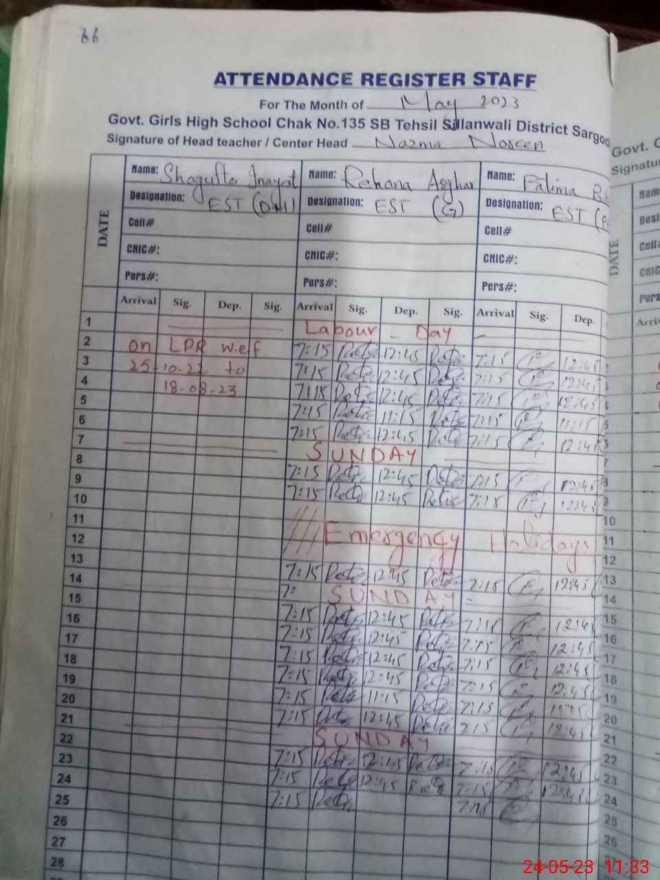 | 35**** | Sh**** Pe**** | Contract | 0 | 11 | 0 | 0 | 0 | 0 | 0 | 0 | 0 | Exam Duty | |