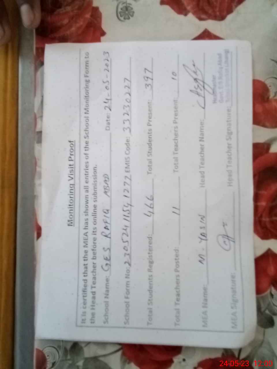 | Attendance Register | Head Teacher | MEA with School | Visit Proof |