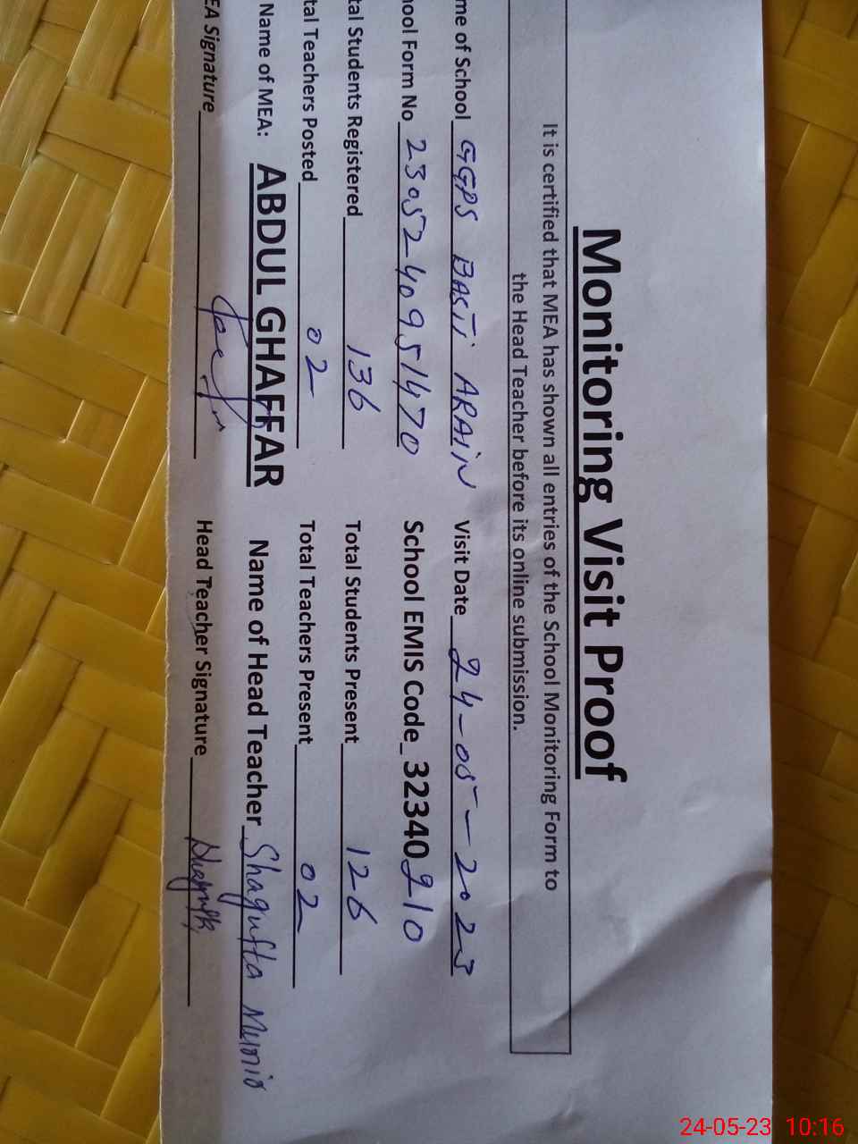 | Attendance Register | Head Teacher | MEA with School | Visit Proof |