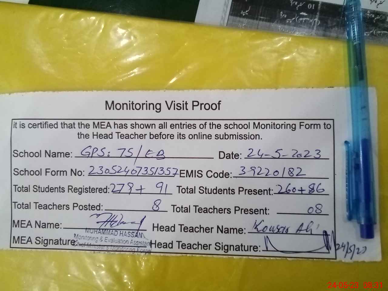 | Attendance Register | Head Teacher | MEA with School | Visit Proof |