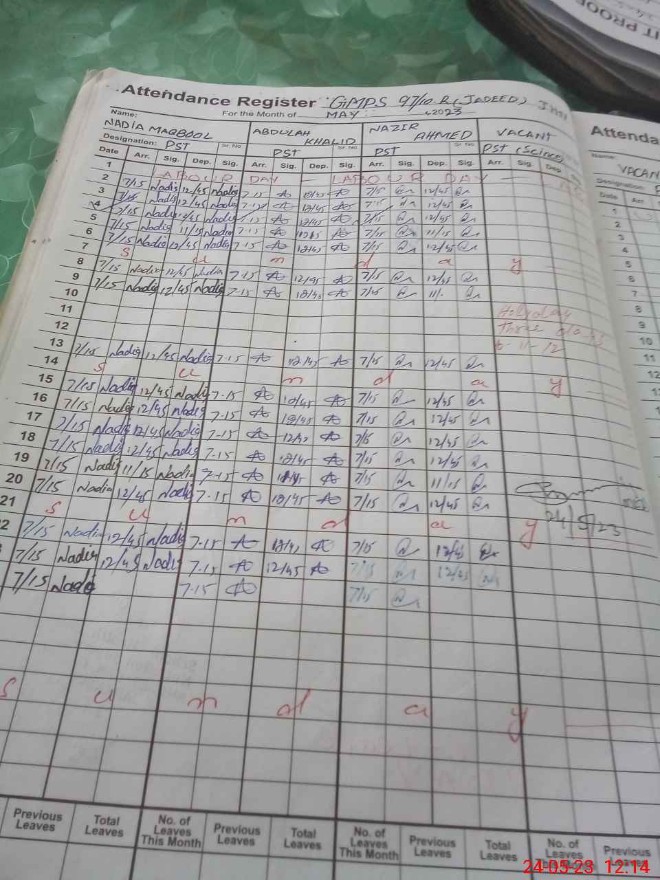 | CNIC | Full Name | Designation | R/C | Absence During Last Calender Month |